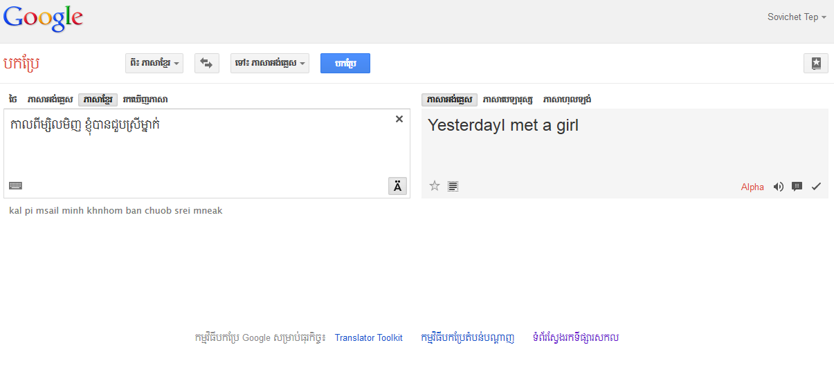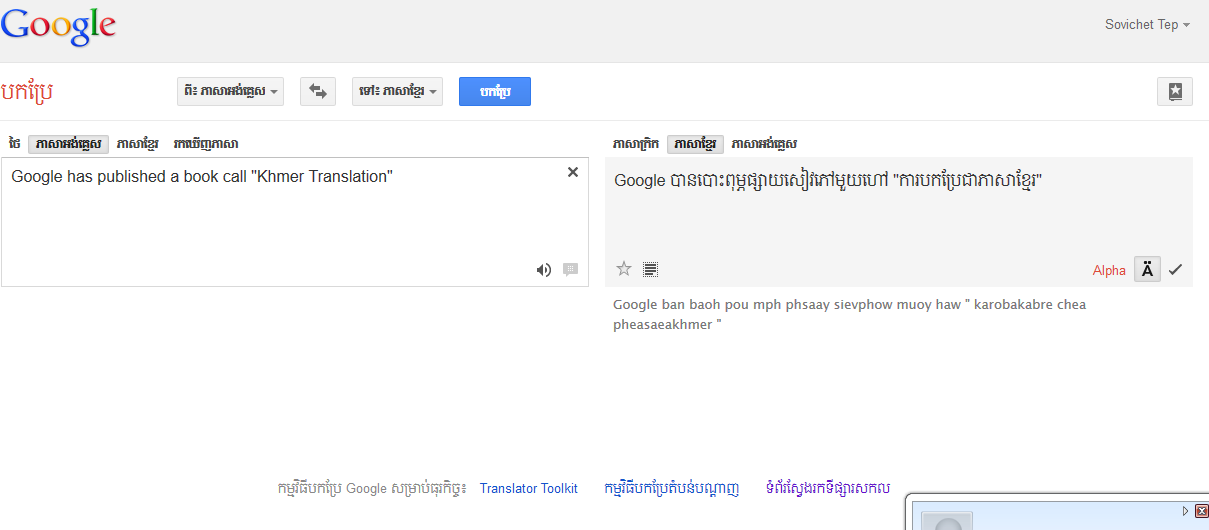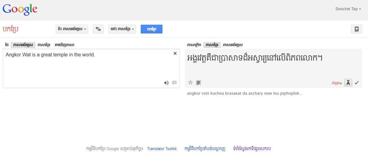 តែនៅពេលនេះការរង់ចាំរបស់យើងទាំងអស់គ្នាបានចេញជាលទ្ធផលហើយ គឺនៅពេលនេះ Google Translate បានបញ្ចូលភាសាខ្មែរទៅក្នុងកម្មវិធីរបស់គេហើយ ក៏ប៉ុន្តែស្ថិតនៅក្នុងកំណែ Alpha ដំបូងប៉ុណ្ណោះ គឺការបកប្រែមិនទាន់ត្រឹមត្រូវច្រើនឡើយ ក៏ប៉ុន្តែយើងក៏អាចចូលរួមឲ្យការបកប្រែនេះល្អថែមទៀតដែរ ដោយធ្វើការវាយតម្លៃទៅលើការបកប្រែនិមួយៗ។